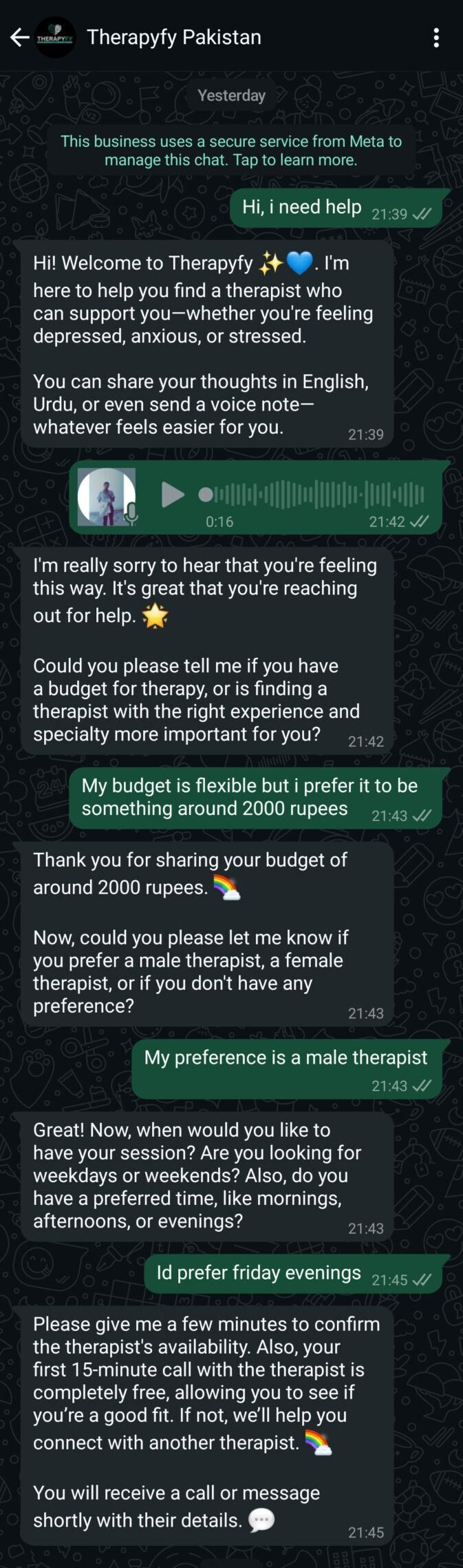 As Pakistan’s first automated therapy platform, we connect you with expert, licensed therapists who truly understand your needs. Our secure, flexible sessions are designed to empower you on your journey to wellness.